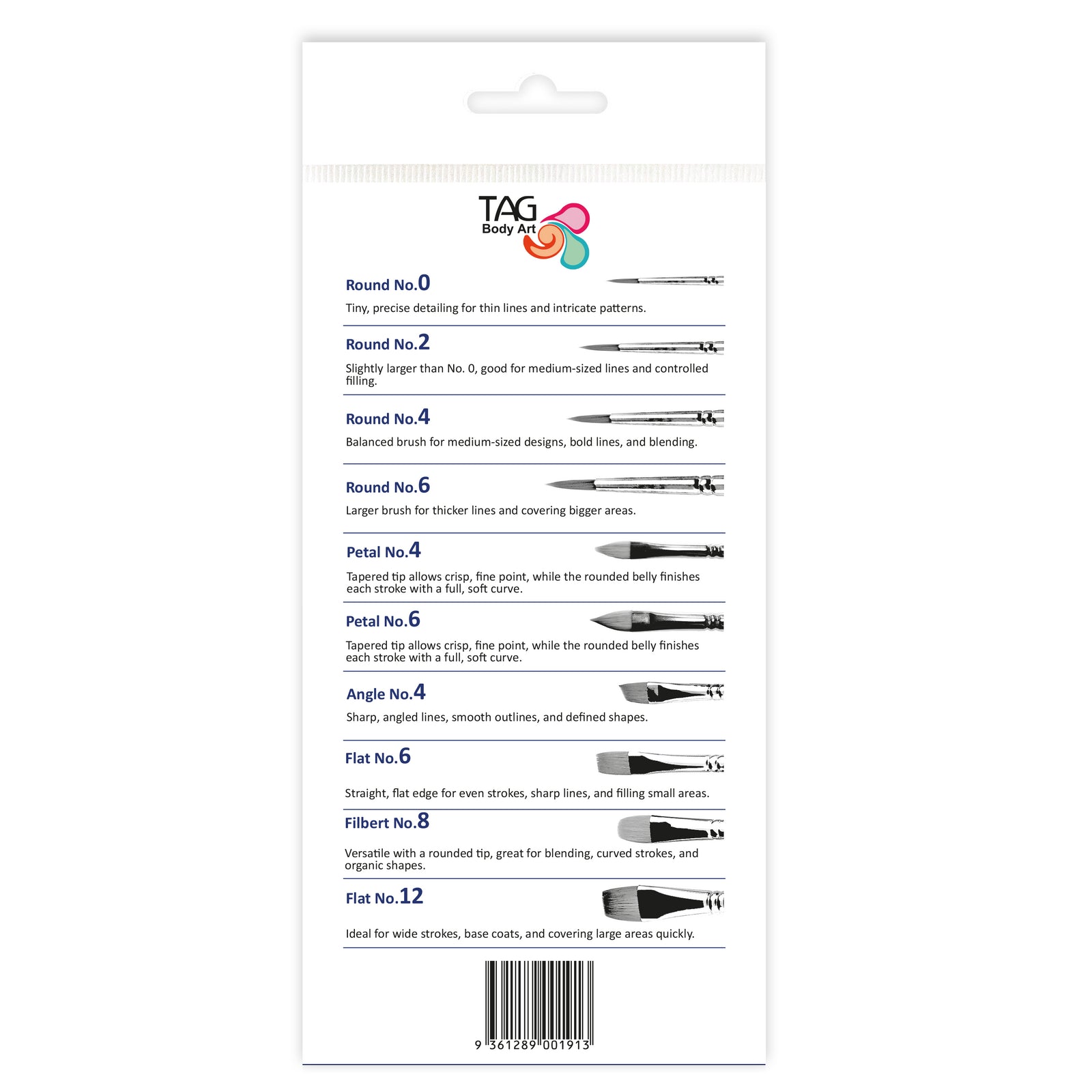 10 Piece Brush Set includes: 5 different brush types and 6 different brush sizes.