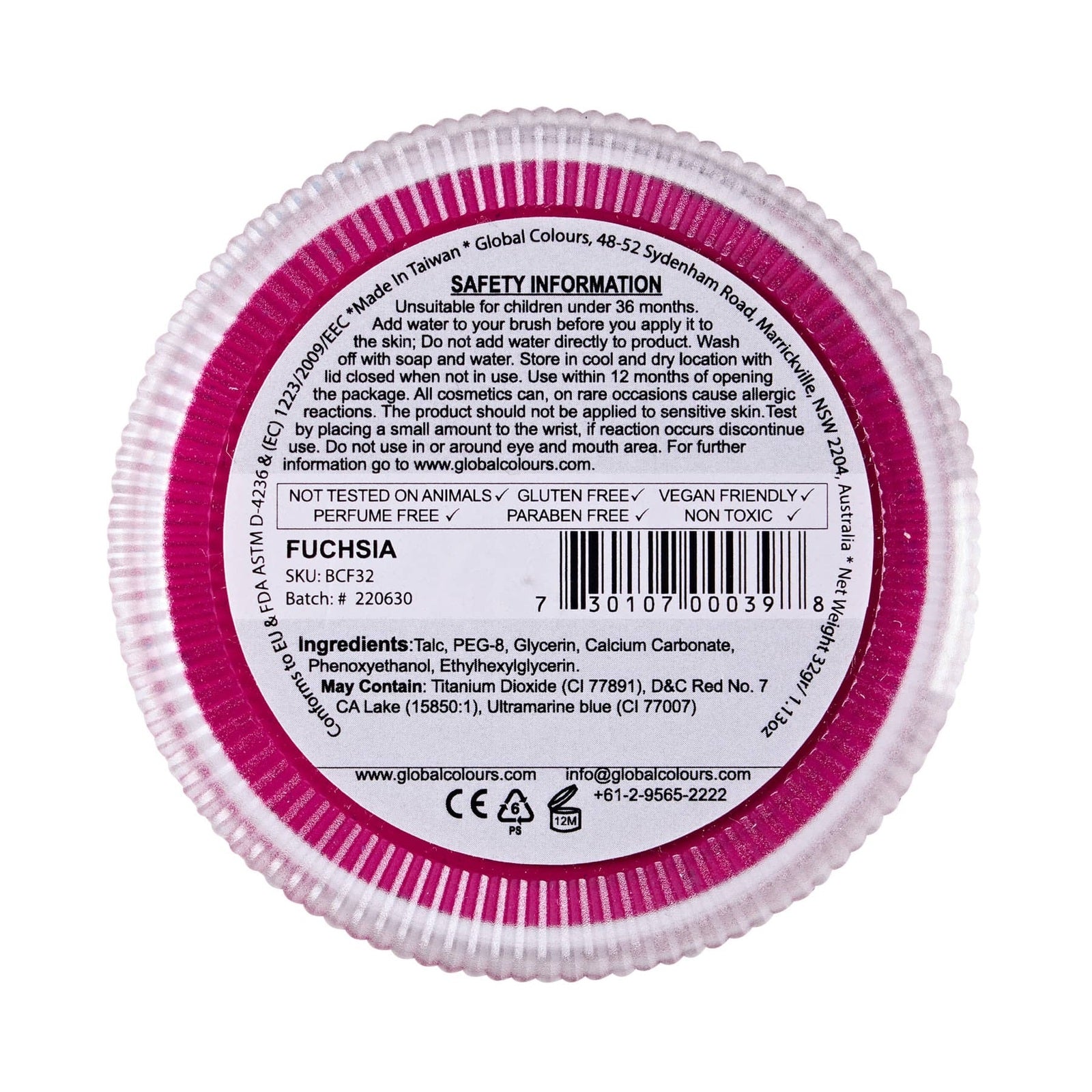 Directions for use: Activate the face paint with sealer or water to a creamy consistency and apply to the skin. The paint will keep that creamy consistency for a few minutes before drying down, allowing the artists to manipulate the placement on the skin with a sponge, dry brush or smudger tool. This formula can also be used dry, with a dry crush to create a smokey, transparent effect. For best large surface area, streak-free results use in a buffing motion with our Global Colours Small or Large Kabuki Brush.