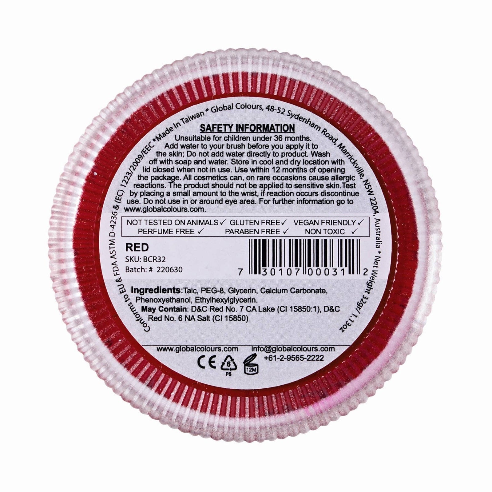 Directions for use: Activate the face paint with sealer or water to a creamy consistency and apply to the skin. The paint will keep that creamy consistency for a few minutes before drying down, allowing the artists to manipulate the placement on the skin with a sponge, dry brush or smudger tool. This formula can also be used dry, with a dry crush to create a smokey, transparent effect. For best large surface area, streak-free results use in a buffing motion with our Global Colours Small or Large Kabuki Brush.