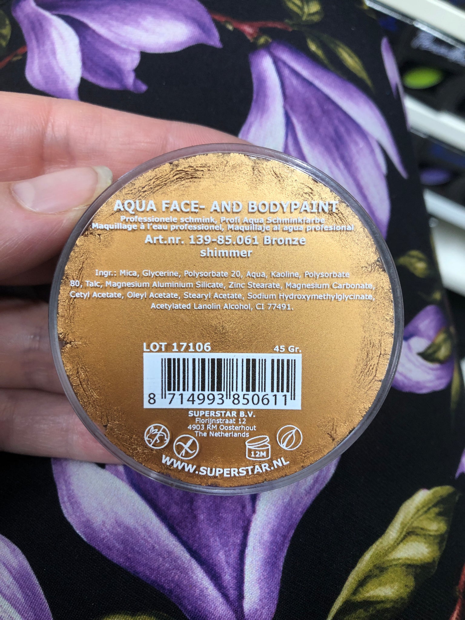 The make-up is produced in the Netherlands by Superstar and is approved according to the European directives. It contains no parabens, no perfume and has not been tested on animals.